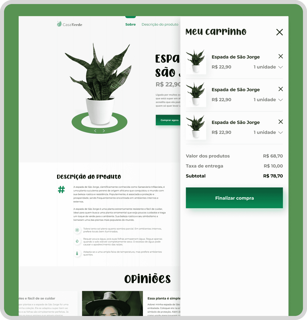 Casa Verde é um conceito de e-commerce pensado para amantes de plantas. Com um design intuitivo, o site facilita a compra de espécies variadas e oferece conteúdos educativos sobre cuidados, características e curiosidades de cada planta, ajudando a resolver desafios como engajamento e aumento de receita.