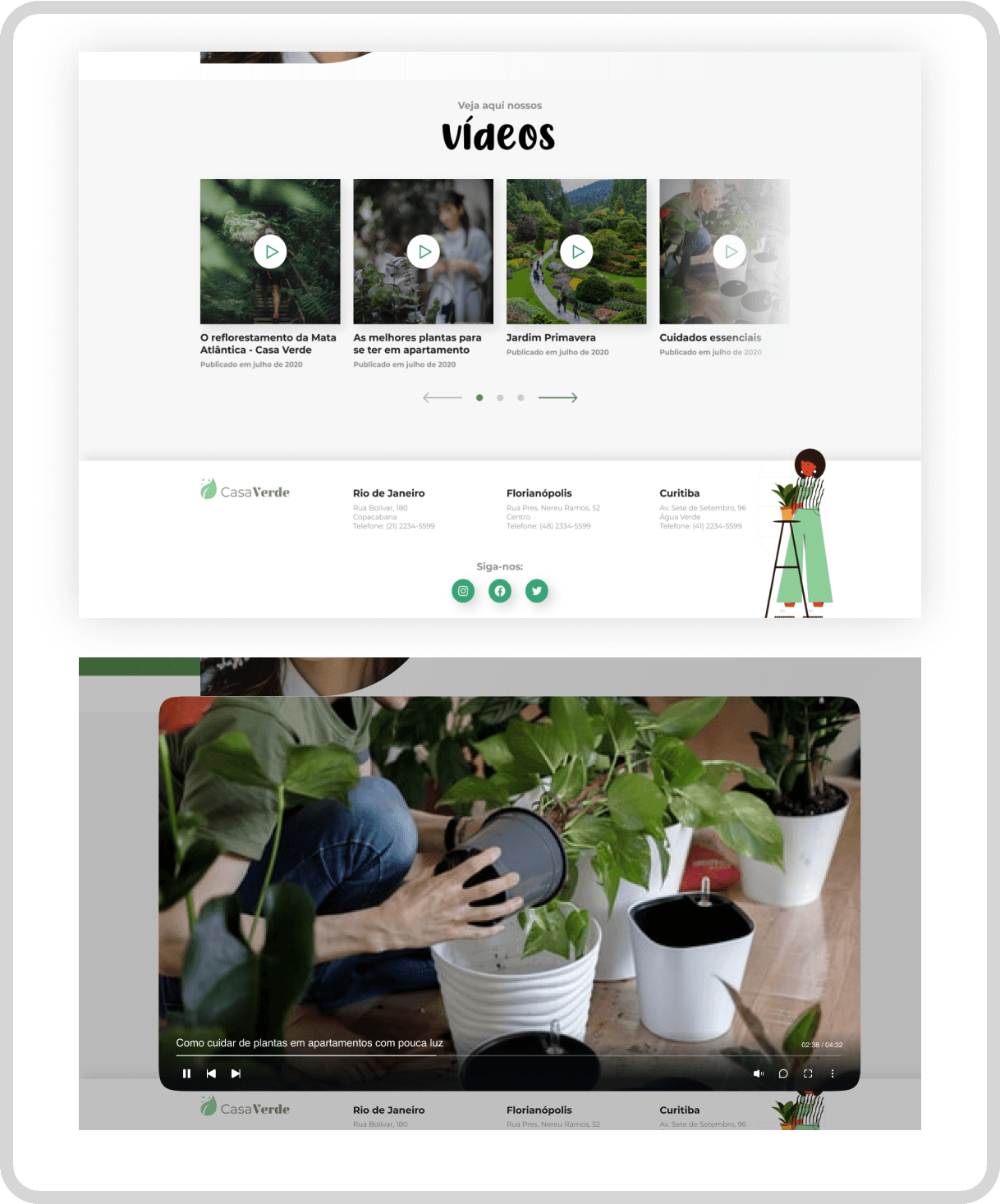 Projetei funcionalidades que garantem informações relevantes, auxiliando na decisão de compra. Destaque para os accordions que organizam detalhes sobre cuidados, características, curiosidades, artigos e vídeos. Além disso, um recurso interativo permite girar a imagem da planta em 360°, oferecendo uma visão completa do produto.